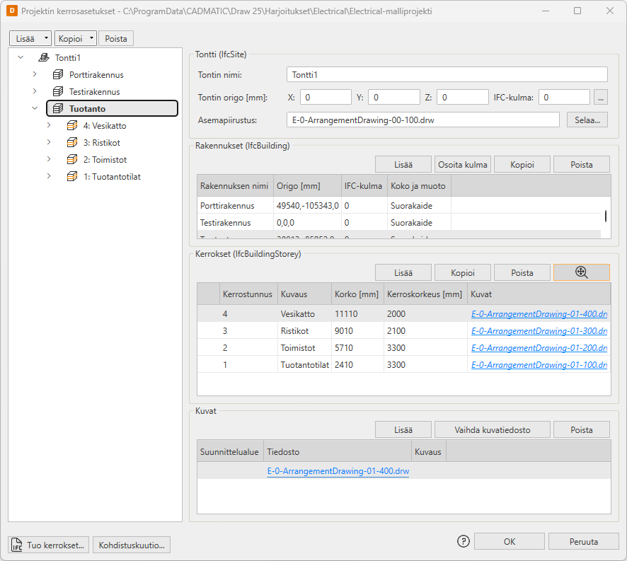 Voit tuoda kerrostietoja Electricaliin IFC-mallin avulla ja sitten muokata asetuksia ja lisätä kerroksiin liittyviä tiedostoja. Tuo kerrokset  -toiminto tuo mallista kaikki osat, eli tontin, rakennukset ja kerrokset, mutta ei niihin liitettyjä tiedostoja. Huomioi, että jos kerrosasetuksia on jo määritelty, ne korvataan mallista tuotavilla valittuasi IFC-tiedoston.