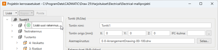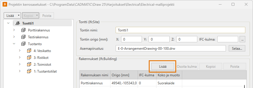 Kerrosasetukset voivat sisältää useita rakennuksia. Rakennukselle määritetään nimi, origo, IFC-kulma sekä vapaamuotoisena tietona koko ja muoto.