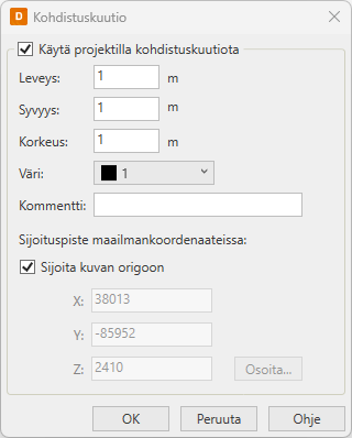 Kohdistuskuutiolle voi määrittää mitat, värin ja kommentin. Sijoituspiste on aina maailmankoordinaateissa, ja se voi olla suoraan kuvan origo tai se voidaan antaa koordinaatteina tai osoittaa kuvasta Osoita-painikkeella.