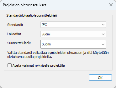Määrittele käytettävä projektikohtainen standardi (esim. ANSI tai IEC), lokaatio ja suunnittelukieli.