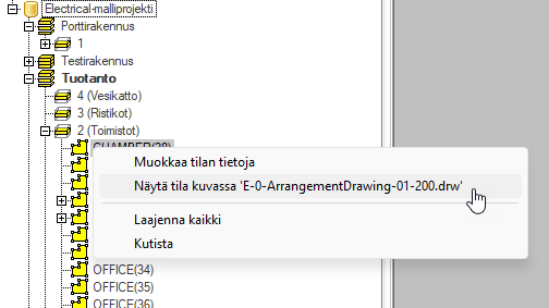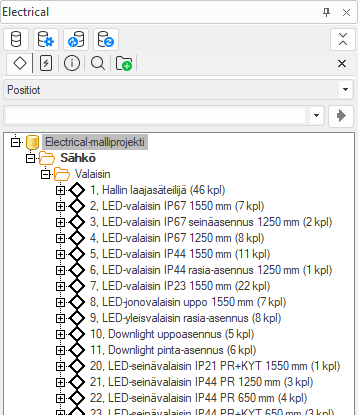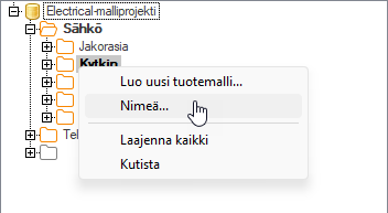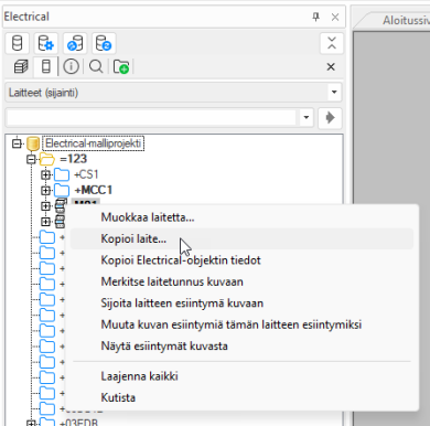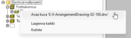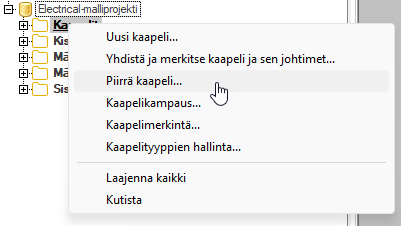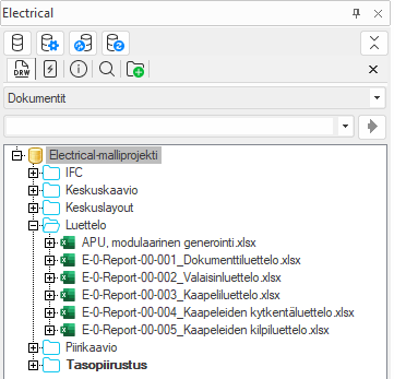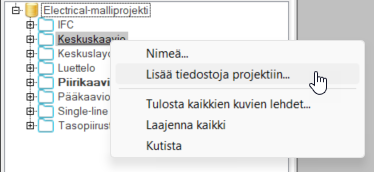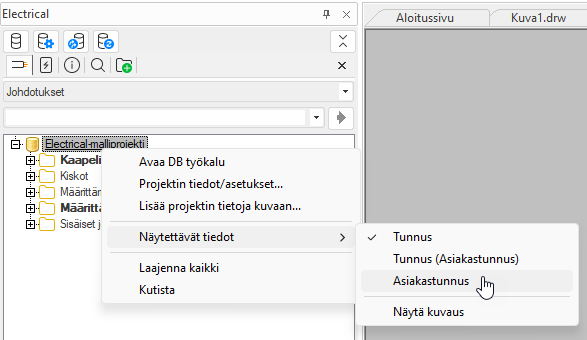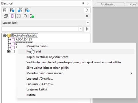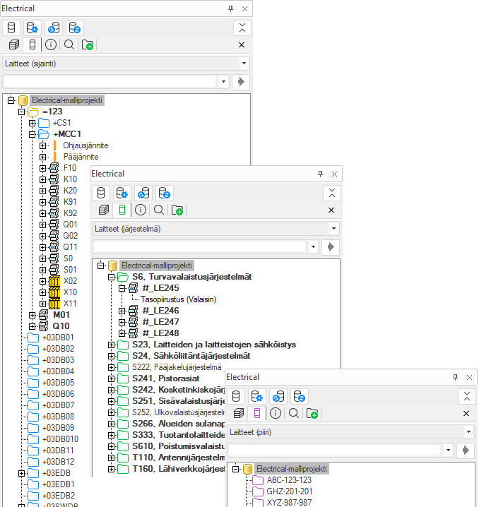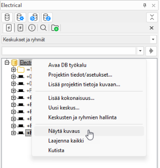 Projektipuun sisältävät Electrical- ja Electrical 2  -ikkunat avautuvat oletusarvoisesti ruudun vasemmalle puolelle. Jos olet sulkenut ikkunan, saat sen auki esimerkiksi Ominaisuudet-ikkunan kautta napsauttamalla otsikkoriviä hiiren kakkospainikkeella ja valitsemalla Electrical- tai Electrical 2  -vaihtoehdon.