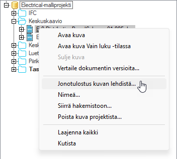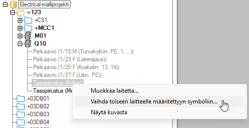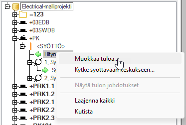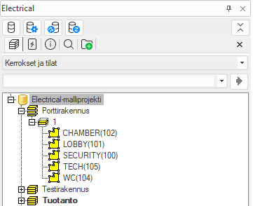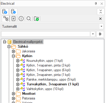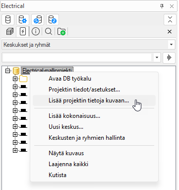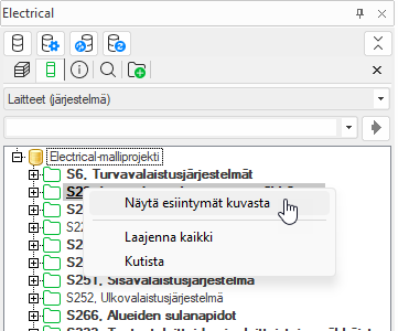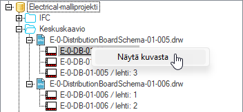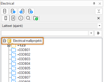 Projektipuussa näkyy tietoa (sijainnit, laitteet, kaapelit jne.) aktiivisesta kuvasta tai koko projektista. Projektipuun avulla voit navigoida kuvan eri osien välillä ja muokata laitteita ja muita kuvan tietoja. Sijainneista, laitteista, riviliittimet, kaapeleista ja johtimista tulee projektin tietoja, minkä jälkeen voit muokata niitä DB-työkalulla. Jos dokumenttia ei ole lisätty projektiin, kaikki muokkaukset kohdistuvat vain avoinna olevaan dokumenttiin.