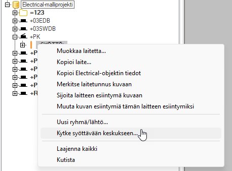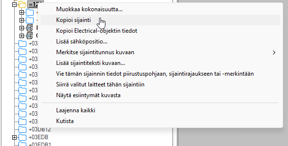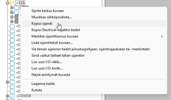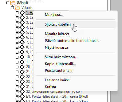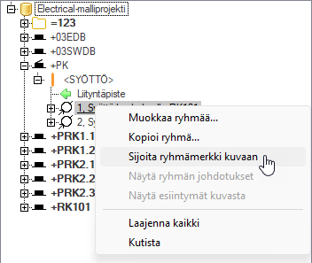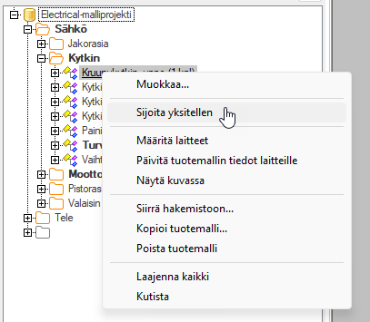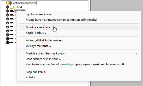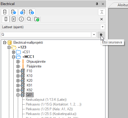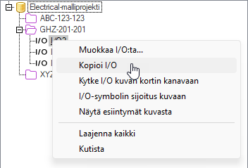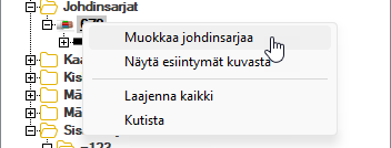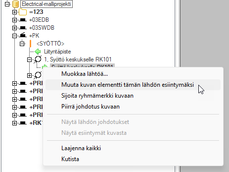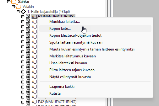 Kun napsautat hiiren kakkospainiketta Etsi-puun haaran päällä, saat näkyviin kyseiseen haaraan liittyvät toiminnot. Toiminnot ovat valitusta haarasta riippuen samat kuin esimerkiksi laite-, johdotus- ja tuotemallipuissa; voit esimerkiksi sijoittaa laitteen esiintymän kuvaan helposti tai muokata laitetta.