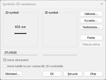 Jos haluat, että valittua 3D-symbolia käytetään aina jatkossa kuvaamaan 2D-symbolia, valitse Aseta oletukseksi. Tällöin vastaavuus lisätään asetustiedostoon (so3dsymbol.ini), muussa tapauksessa vastaavuus merkitään kyseisen 2D-symbolin attribuuttiin ($3DSYMBOL$).