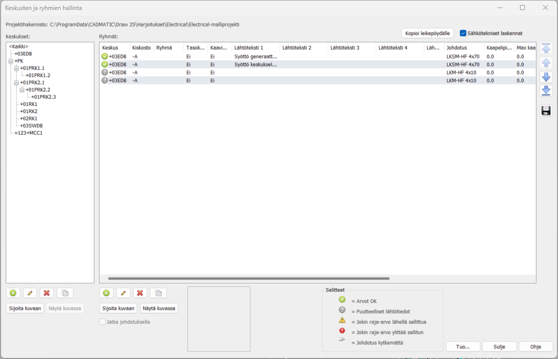 Nähdäksesi sähkötekniset laskelmat syötä tehotieto tai valitse Lue kuvasta. Kuvasta teho luetaan johdotuksen avulla ryhmään kytketyiltä symboleilta ja sähköpisteiltä, jolloin ryhmän teho muuttuu kuvan muutosten mukana.