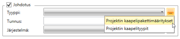 -painiketta napsauttamalla voit valita tyypin kaapelipakettimääritysten valinnan kautta valitsemalla Projektin kaapelipakettimääritykset tai kaapelityyppien valinnan kautta valitsemalla Projektin kaapelityypit.