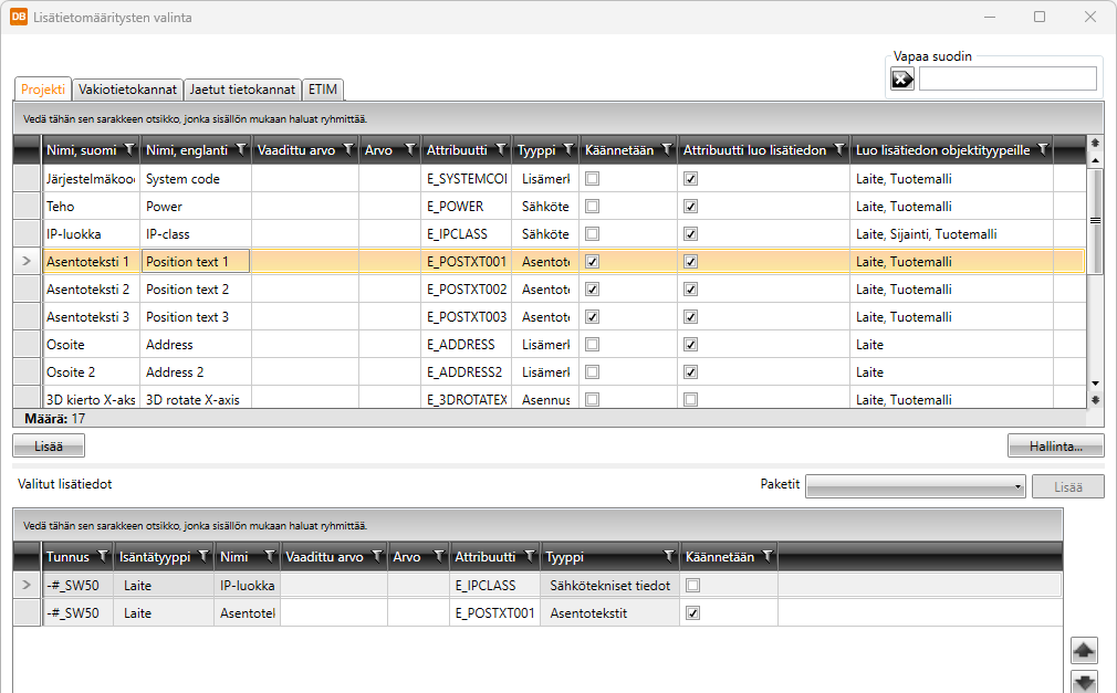 - ETIM – Tämä välilehti näyttää ETIM (European Technical Information Model) -tiedot.