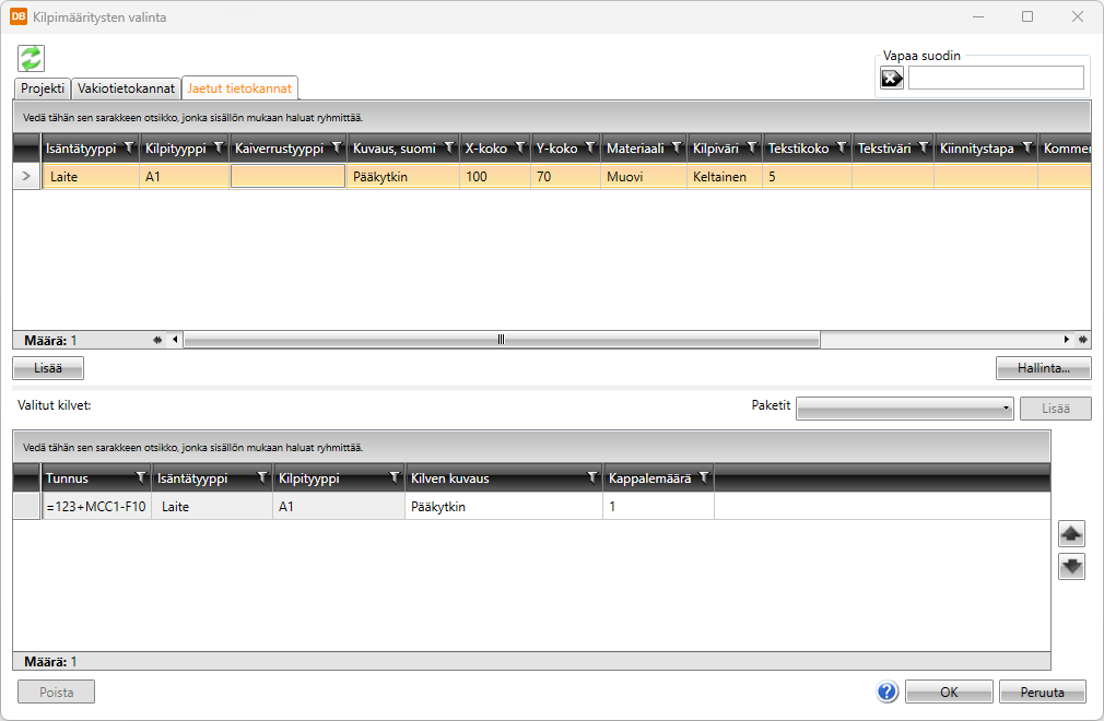 - Projekti – Tämä välilehti näyttää projektilla jo olevat kilvet.