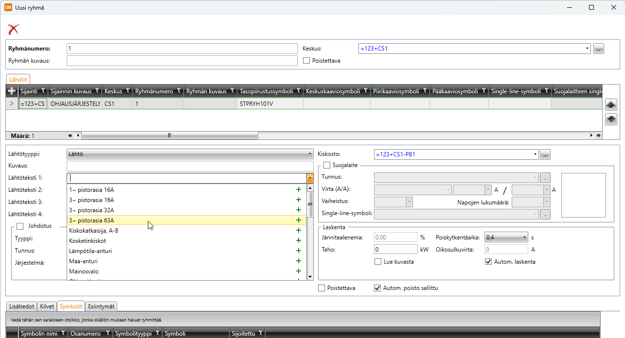 Symbolit-välilehdeltä näet kaikki sijainnin symbolit. Peittävien ryhmämerkkien tausta peittää sen alle jäävät johdotukset sekä muut elementit parantaen näin kuvan luettavuutta joissakin tilanteissa.