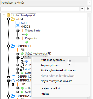 Ryhmän muokkauksen voi aloittaa myös kuvasta kaksoisnapsauttamalla ryhmää tai puusta napsauttamalla ryhmää hiiren kakkospainikkeella ja valitsemalla Muokkaa ryhmää.