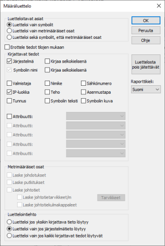 Kirjattavat tiedot – Valitse, mitä tietoja määräluetteloon kirjataan. Symbolin nimi on aina valittu, koska laskelma perustuu nimenomaan symbolien nimiin. Sekä järjestelmä että symbolin nimi voidaan halutessa kirjata selkokielisenä. Symbolin selkokielisen nimen täytyy olla ohjelman tiedossa, ja Draw'n mukana tulevien symbolien osalta näin onkin. Symbolille voi itse kertoa uuden selkokielisen nimen Aseta symbolin luettelonimi -toiminnolla.