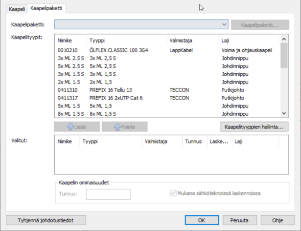 Lisää kaapelityyppi kaapelipakettiin kaksoisnapsauttamalla sitä. Vaihtoehtoisesti voit valita haluamasi kaapelityypin Kaapelityypit-listalta ja napsauttaa Lisää-painiketta. Kaapelityyppi siirtyy Valitut-listalle.