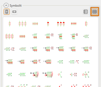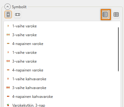 Voit tarkastella symboleja joko rivi- tai kuvakeluettelomuodossa: