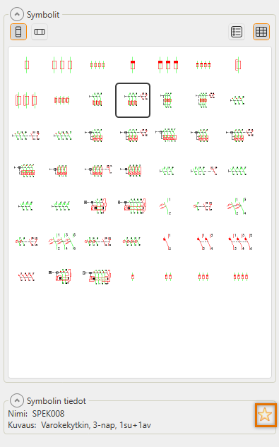 Suosikkisymbolit – Tällä välilehdellä näet symbolit, jotka olet määritellyt suosikeiksesi joko Symbolit-ikkunassa tai Symbolin valinta -dialogissa (katso Symbolin valinta). Voit määritellä symboleja suosikeiksesi napsauttamalla symbolia hiiren kakkospainikkeella ja valitsemalla Lisää suosikkeihin. Voit valita suosikkisymbolejasi avoinna olevasta kuvasta tai projektista sekä Electrical-symboleista. Tarvittaessa voit poistaa symbolin suosikeistasi napsauttamalla sitä hiiren kakkospainikkeella ja valitsemalla Poista suosikeista. |