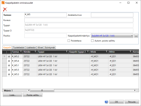 Dialogissa voit lisätä ja poistaa kaapeleita sekä valita kaapelipaketille tuotetietoja, lisätietoja ja kilpiä.