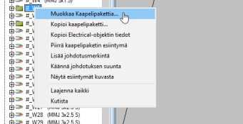 Voit piirtää kaapelipaketin kuvaan myös projektipuun kautta napsauttamalla pakettia hiiren kakkospainikkeella ja valitsemalla Piirrä kaapelipaketin esiintymä.