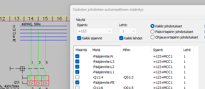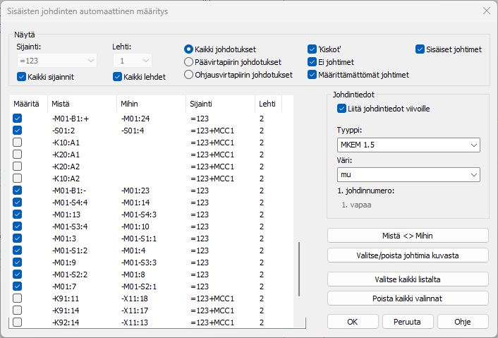 Jos johtimen molemmista päistä ei löydy kytkentätietoa (esim. K10:A1 ensimmäisessä kuvassa), sitä ei oletusarvoisesti määritetä. Myöskään vierekkäisiä riviliittimiä ei oletusarvoisesti määritetä (esim. X10:1 > X10:2).