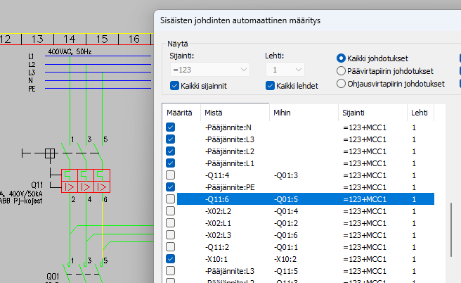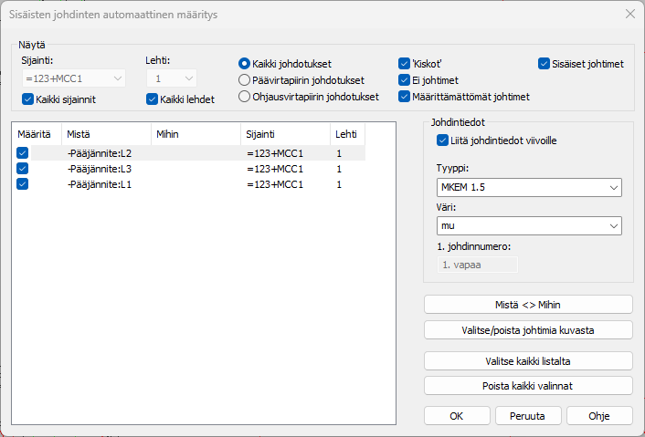 Voit avata määrittelytoiminnon myös valitsemalla viivat kuvasta, napsauttamalla hiiren kakkospainiketta ja valitsemalla Sisäisten johdotusten autom. määritys. Tällöin dialogissa näytetään vain ne johtimet, jotka kuvasta valittiin:
