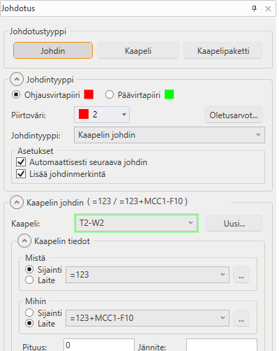 Jos valitsit piirrettäväksi määrittämättömän, sisäisen tai johdinsarjan johtimen tai kiskon ja haluat yhden johtimen piirrettyäsi jatkaa seuraavan piirtoon siten, että numerointi jatkuu, valitse Automaattisesti seuraava johdin. Kaapelin johtimille asetus ei ole käytettävissä.