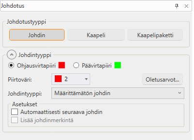 Tällä toiminnolla voit piirtää päävirtapiirin tai ohjausvirtapiirin johtimen Johdotus-ikkunan avulla. Tarvittaessa voit valita piirrettäväksi myös kaapelin tai kaapelipaketin.