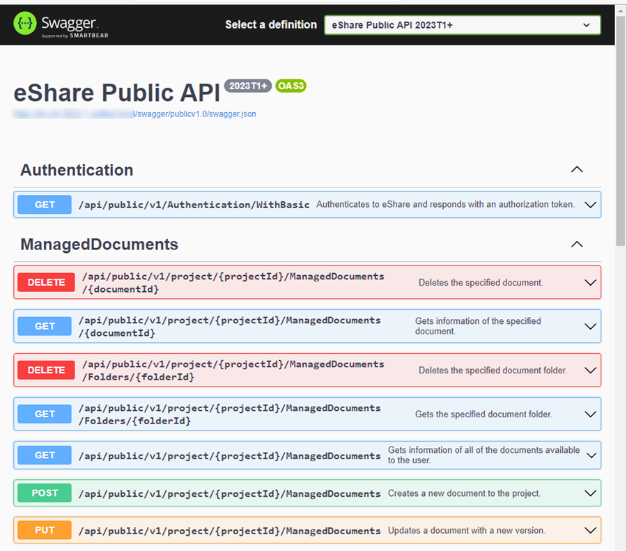 URL of the endpoint (the format is <eShare address> + <the address given by the endpoint>, for example https://cadmatic.eshare.com/api/public/v1/Projects)