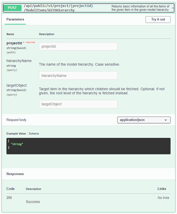The user interface contains all the endpoints of the REST API, as well as an explanation on what they do and how they work. The endpoints are divided to sections (Authentication, ModelItems, etc.), and they list the following information: