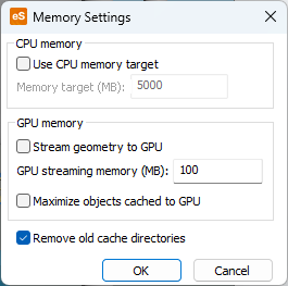 If CPU memory target is not used, GPU memory can be used. Stream geometry to GPU controls the streaming of triangulated geometry to GPU. Enabling or disabling this option requires