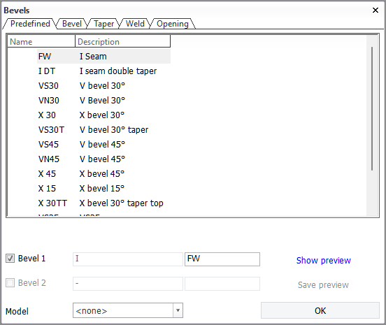 Show/hide preview – Shows a preview of the bevel's appearance with the current parameters. The image in the preview is updated when a parameter is changed.