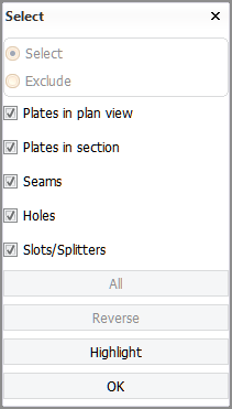 Select one or two plates, a seam, a hole or a slot/splitter.