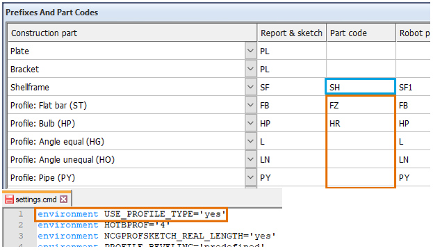To do this, the environment setting USE_PROFILE_TYPE='yes' must be added to the settings.cmd file in the project norms. When set to 'no', the part code set for Shellframe will be used.
