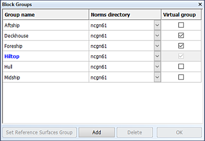 Note: In case no group names have been defined, blocks can be assigned to the "Hull" group only.