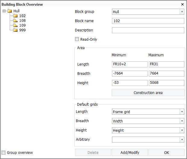 This is the same function as Tools > Information > Building Block Overview function in the 2D-Contek and 3D-Contek applications, but with the extra functionality to modify the settings of each block. You can set the block name, define the block area, set the default grids, and add a description. You can also predefine blocks.