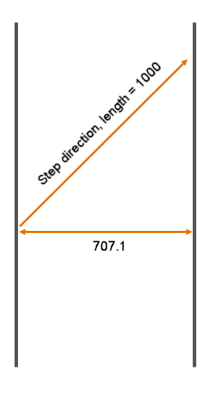 Optionally, set the Step direction. Sets the direction along which the step length should be measured. For example, in a width grid with a step of 1000 and a step direction of (0,1,1), the resulting distance between two consecutive grid lines will be 707.1.