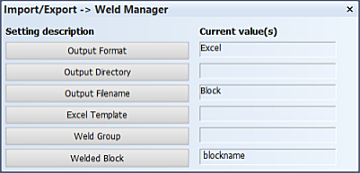 Select which weld group data fields to include in the export. This setting is used in all project locations. This setting is stored in %ncgpath%\norms\cvar\weld\weldmgr.cfg.