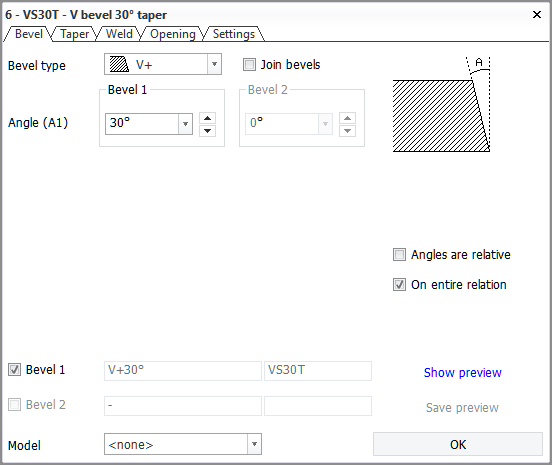 Note: Even though you can define up to 999 predefined bevels, only the first 30 will show up in the bevel selection list in the Green functions in the 3D-Contek application. This means that users can select from a maximum of 30 predefined bevels, regardless of how many predefined bevels are defined.