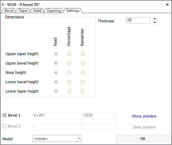 With the settings used here, if the plate thickness is other than 10 mm, the nose height and lower bevel height will stay as is, and the thickness difference will affect the upper bevel height because it is set as a Remainder dimension.