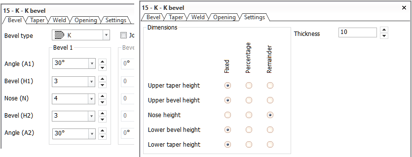 For example, if the thickness is changed to 12 mm, with the bevel dimensions defined in the Bevel tab shown in the image above, the resulting upper bevel height (H1) would be 5 mm.