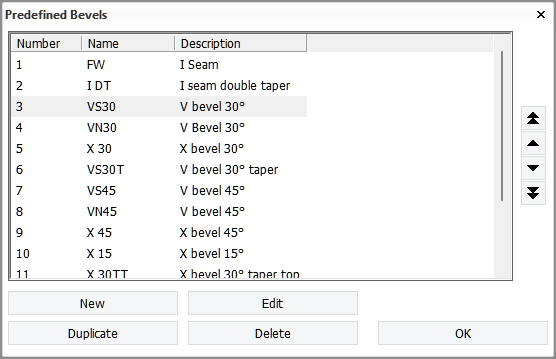 Use the arrow buttons on the right to change the order of the bevels. Each predefined bevel is assigned a bevel number according to its position on the list. The bevel number is used when defining beveling rules.