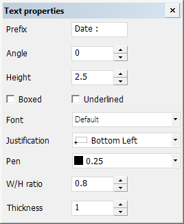 The final information on the sketch will be presented according to these properties, and will be saved together with the template. If the field defines a figure on the sketch, all properties may not be relevant. The Text length option in the Sketch Layout dialog can help to define the maximum area used in relation with the ratio and text height properties. The Text length property will not be saved: A length of 10 will be used each time the Sketch Layout function is started.