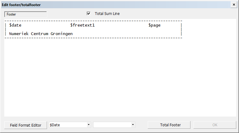You can add a new line before or after the selected line. A selected line can be copied, pasted, or deleted with the normal windows functions. Various $variables can be used in the footer. A $variable may be included anywhere in the line, but the same variable cannot be used twice in the same line. These variables can be used, for example, to include the total weight or total length in the footer. If a subsummary has been created using the sort part, a "total" footer item can be included. This footer item will be inserted at the end of the report.