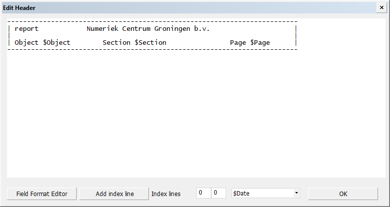 When the header is created for the first time, a default header text is displayed. This header text is taken from the %ncgnorms%\report\header.dat file.