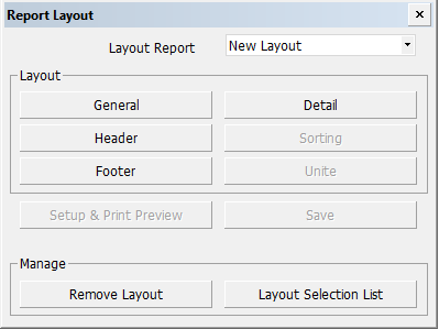 Use this function to create the layout of a report. A layout has six parts that can be created by clicking the corresponding buttons in the Report Layout dialog.