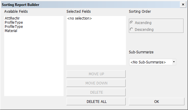 Sub-Summarize – If you select an option other than <No Sub-Summarize>, the items in the list will be grouped according to this criterion, and then sorted. You can select one item for each report from the Sub-Summarize menu. The item selected from the Sub-Summarize menu does not need to be present in the Selected Fields list. See also Footer.