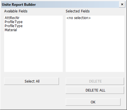 The Unite Report Builder dialog opens when you click the Unite button in the main Report Layout dialog.
