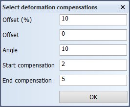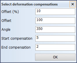 Change the Offset (%), Offset, Angle, and Start compensation and End compensation as desired. For more detailed information on the these values, see steps 3-5 in Applying Deformation Compensation above.