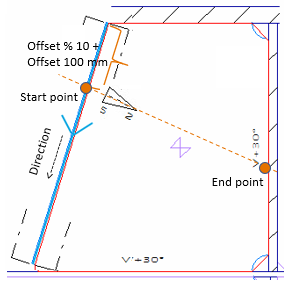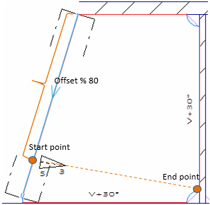 Enter the percentage of offset in Offset (%), and/or absolute offset value in Offset. The offset determines the point where the start compensation is applied. For example, if the length of the side of the plate is 1200, an offset percentage of 50 and an absolute offset of 100 mm will result in an offset of 700 mm (600+100). The start point is also the rotation point for the angle.