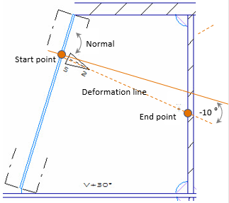 Deformation compensation is applied to two sides (relations) of the plate (a value of zero can be defined for either side). You select the first side relation, and another relation will be the other side where the deformation compensation is applied. This other relation depends on the angle from the rotation point, which is on the first relation.