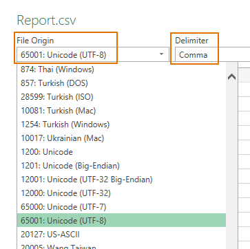The CSV files generated by CADMATIC Hull are encoded in Unicode UTF-8. The files are compatible with Microsoft Excel. However, Excel does not auto-detect that the file is encoded in Unicode, and opens the file as if it was in ASCII format. This results in non-Latin-alphabet text, Cyrillic and Chinese for example, being garbled and unreadable. To fix this, you must import the file to Excel as an Unicode UTF-8 encoded file.