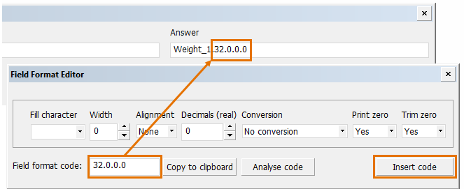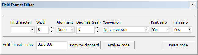 If you want to know which options a field format code consists of, you can paste or enter the code into the Field Format Code field and click Analyse code. The values for the different options are then shown in the fields above the code.
