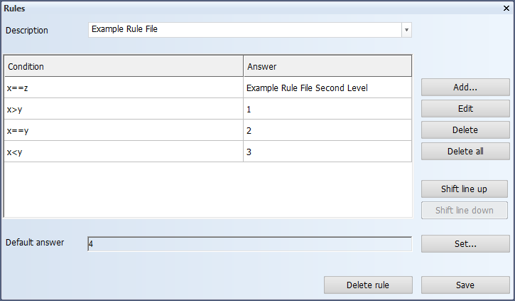 In this example, if x is equal to z, a second rule file will be called instead. If x is not equal to z, the second definition is examined. In that case, if x is greater than y, a value of 1 will be returned. If they are equal, a value of 2 will be returned, and if x is less than y, a value of 3 will be returned. However, if none of the conditions are met, a value of 4 from the Default answer field will be returned.
